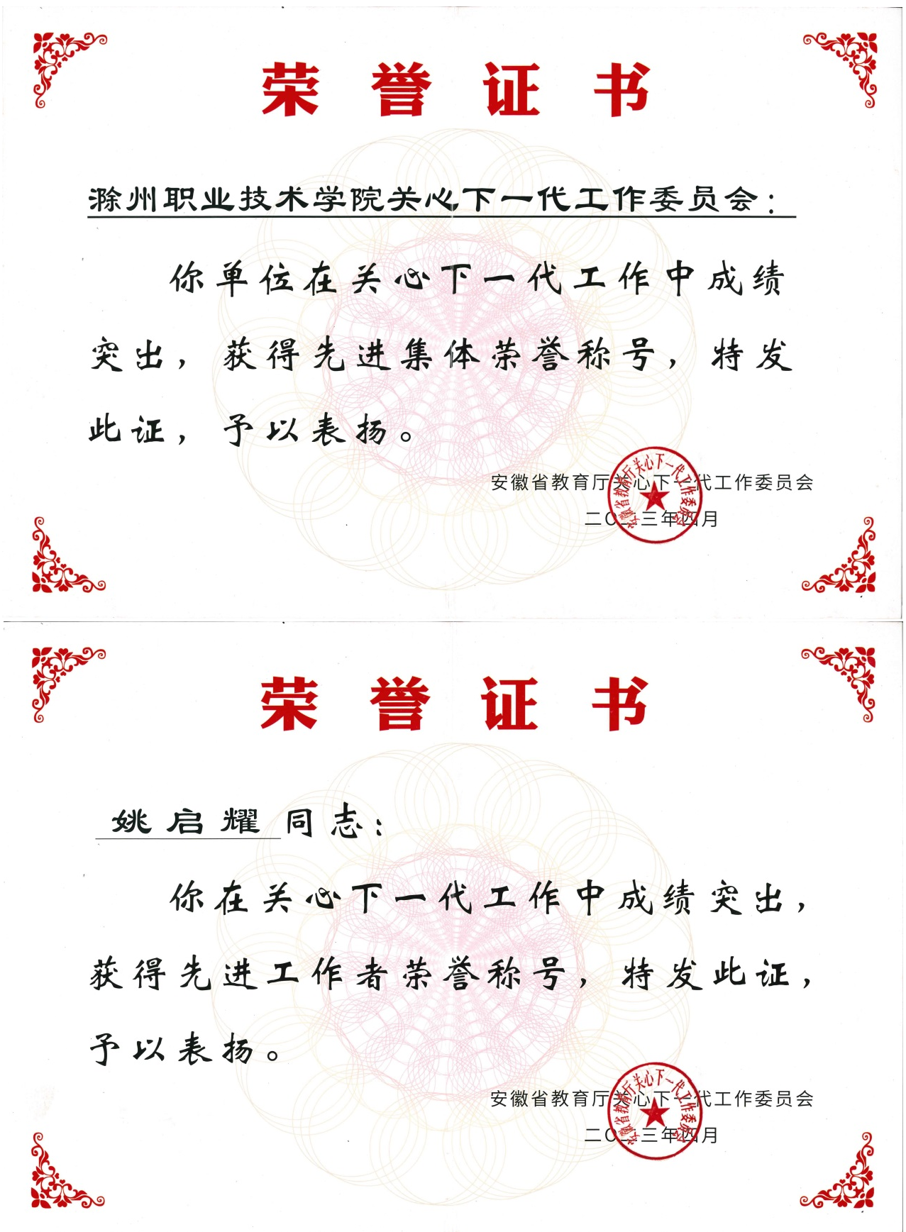 近日,安徽省教育厅关工委对全省教育系统关工委工作进行一次全面评优,并下发皖教秘关〔2023〕7号文件、荣誉证书、奖牌,对 “全省教育系统关心下一代工作先进集体、先进工作者和突出贡献奖获得者”进行通报表扬。全省共有81个单位关工委获得集体荣誉,其中高职高专获此殊荣的仅有7所,滁州职业技术学院关工委名列其中。同时,姚启耀同志荣获“全省教育系统关心下一代工作先进工作者”荣誉称号。