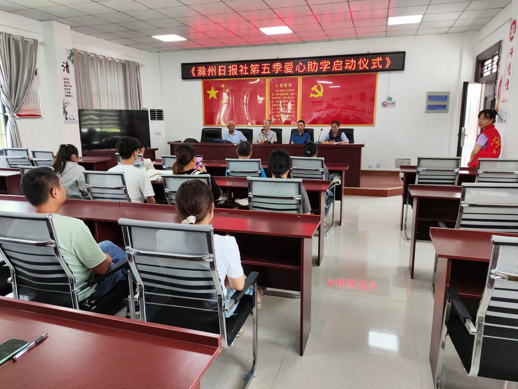 8月23日上午,滁州日报关工委一行赴定远县张桥镇管李村开展爱心助学活动,给该村今年考上大学,家庭有一定困难的学生,每人资助1000元,鼓励他们胸怀目标,好好学习,锻炼身体,努力掌握为中国社会主义现代化服务的专业知识和技能。