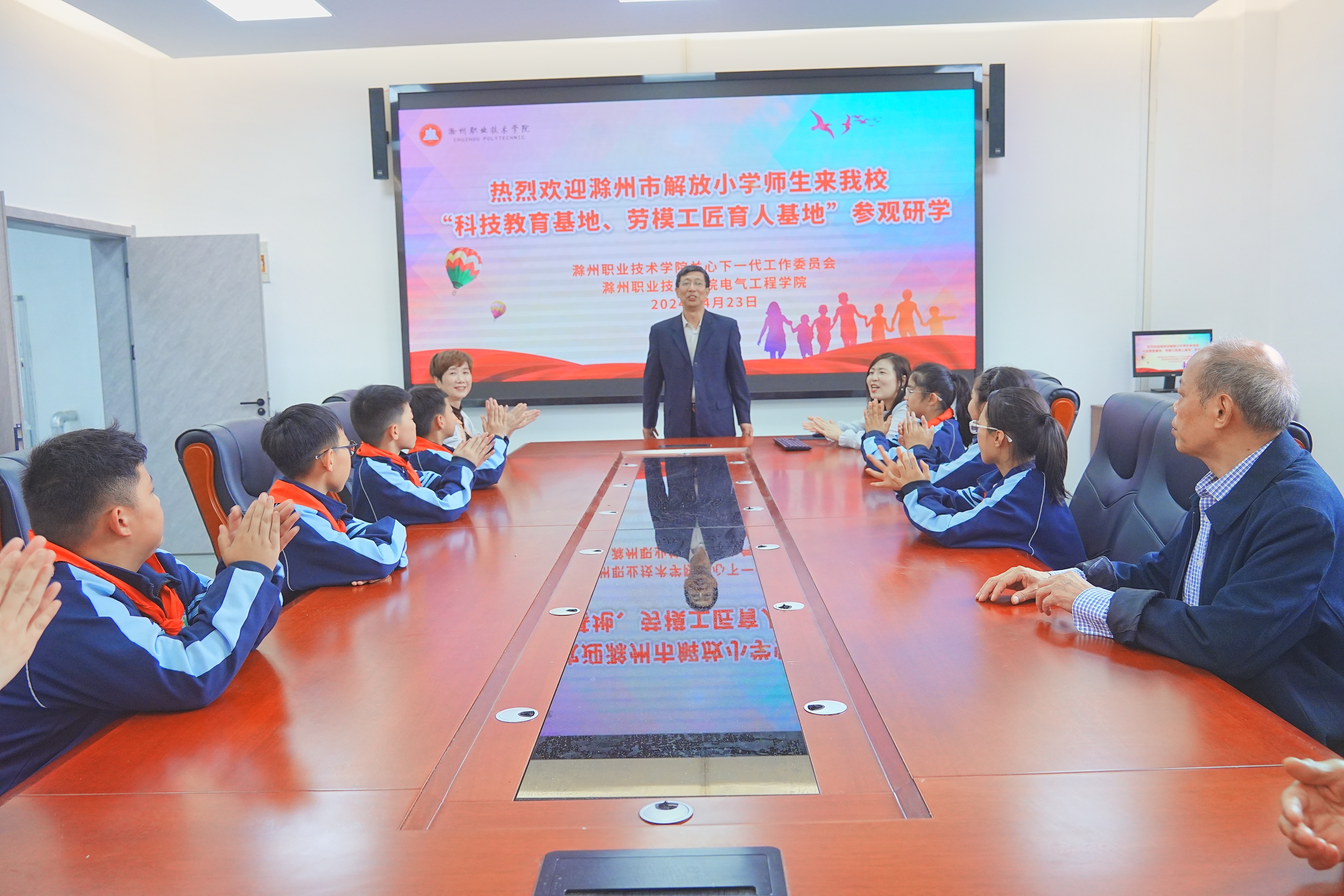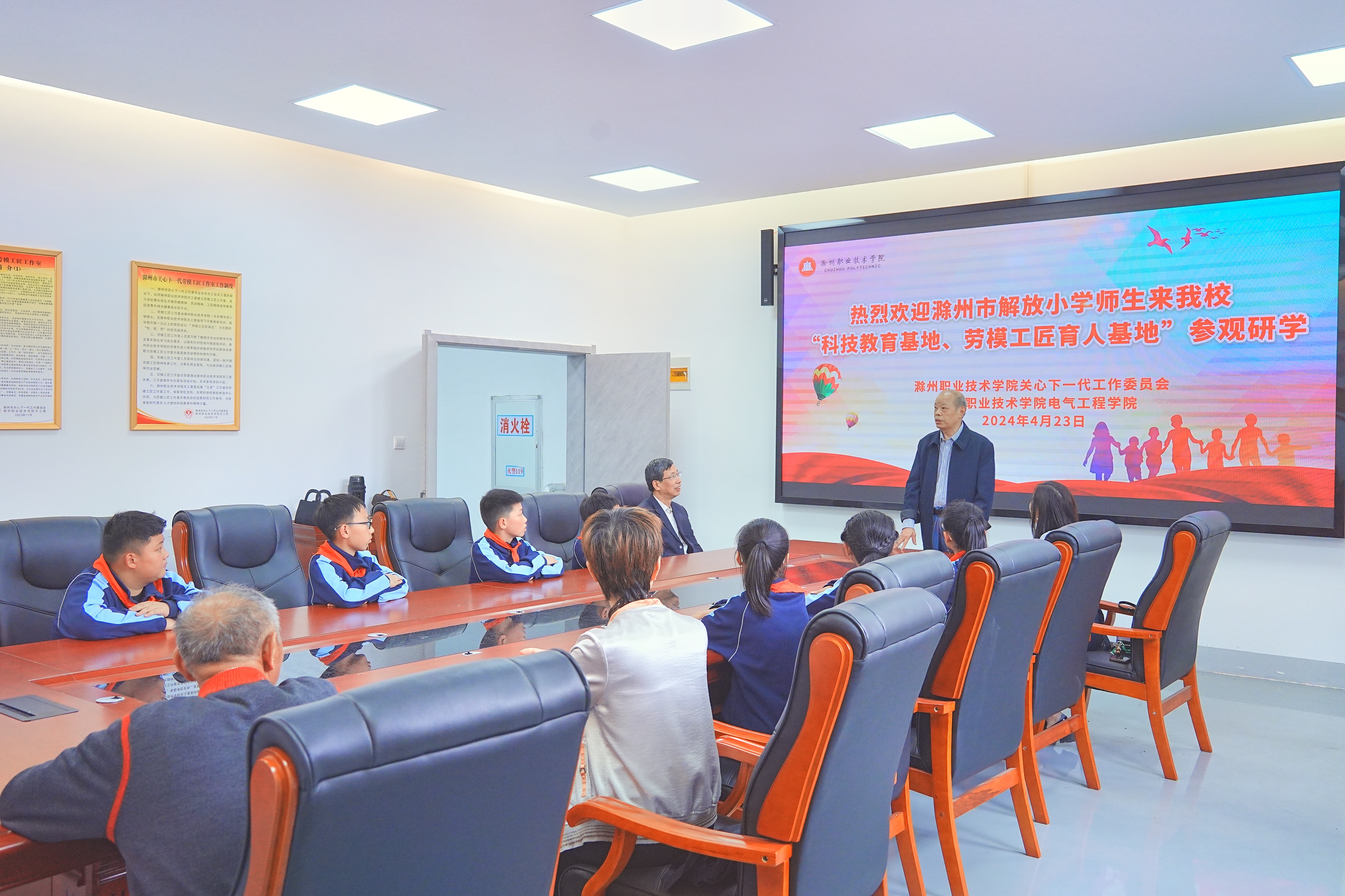4月23日下午,滁州市解放小学部分学生在大队辅导员吴卉兰、班主任赵成圆的带领下到“科技教育基地、劳模工匠育人基地”参观、研学。学校关工委主任姚启耀对解放小学第一批师生表示欢迎。滁州职业技术学院“科技教育基地、劳模工匠育人基地”带头人、电气工程学院院长张信群教授代表滁州市劳模工匠志愿服务者,以小学生能理解、愿意听的方式,从大科普的理念出发,结合滁州光伏、动力电池、新能源汽车等“新三样”赋能生产生活,及学校光伏专业发展的广阔前景,普及了前沿科学知识,激发青少年的好奇心。