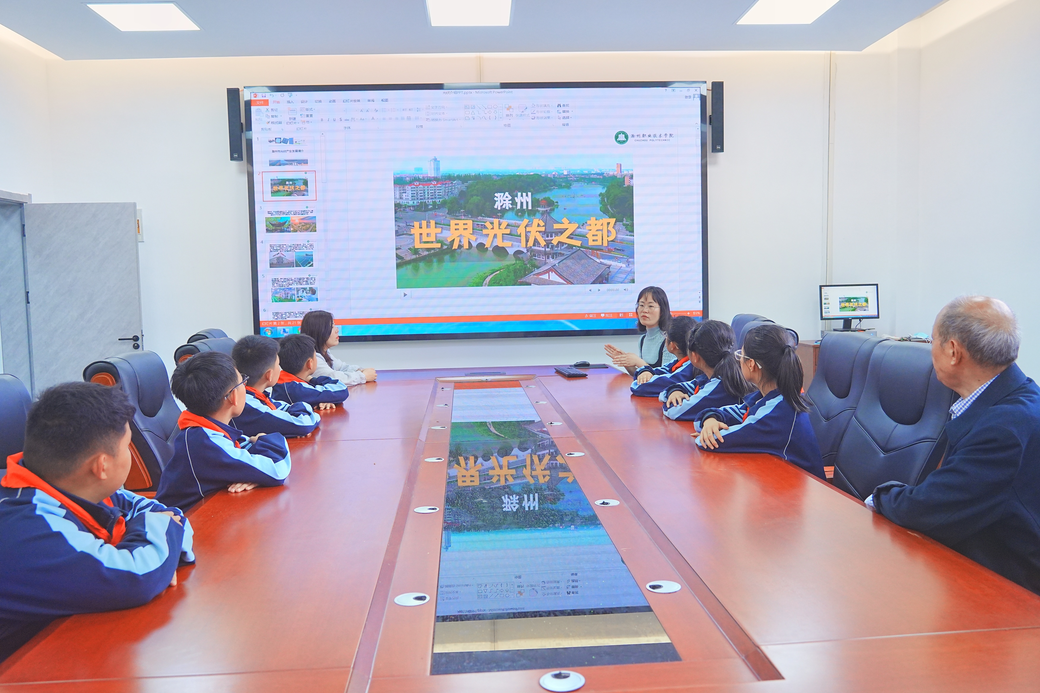 电气工程学院教师陶璐则从专业出发,以《滁州——世界光伏之都》为题,并通过视频、课件等方式向同学们讲解了滁州科技引领,向“新”而行,建设光伏产业,具有明显的高科技、高效能、高质量的新质生产力特征,及滁州需求人才的迫切性。在参观中,实训中心内备战全国职业院校技能大赛的大哥哥们当起了小老师。风光互补发电系统的运作演示,更让同学们个个看得出奇、听得有味,立志为滁州打造世界光伏之都的美好蓝图,好好学习,将来为中国式现代化建设贡献力量。