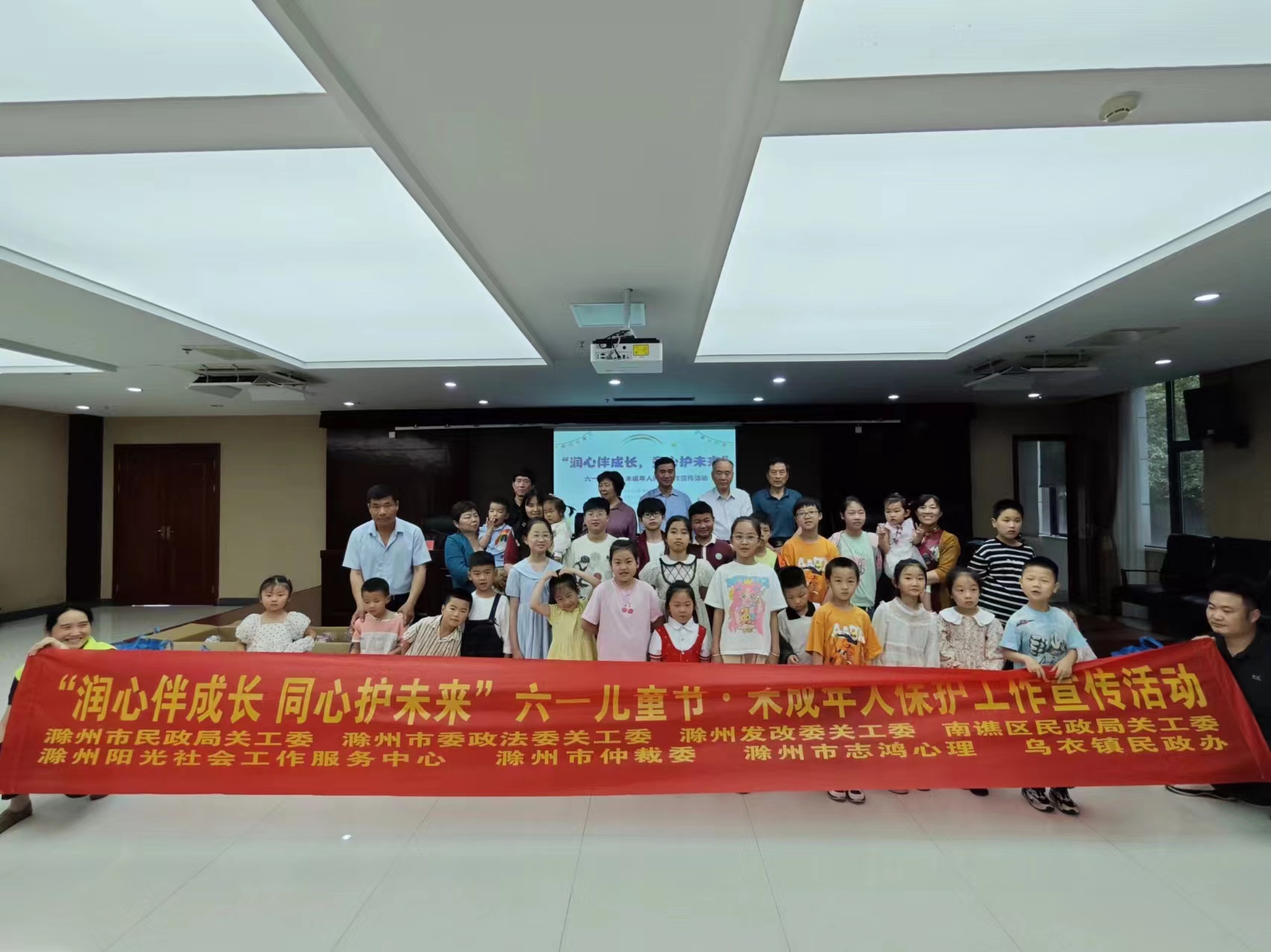 6月1日上午,滁州市民政局关工委、滁州市委政法委关工委、滁州市发改委关工委、滁州仲裁委、联合南谯区民政局关工委、市阳光社工中心等共同到该区乌衣镇开展“润心伴成长 同心护未来”关爱童行 助力成长系列活动。与26名留守、困境儿童及其家长等60余人欢聚一堂共庆六一儿童节。是志愿者老师通过生动的故事,引导小朋友了解六一儿童节来历,增强他们珍惜新时代生活的幸福感,同时进一步深化了我们对党政机关、社会各界,市民对保护未成年人权益,为未成年人创造美好未来的责任认识。针对夏季天气逐渐炎热是溺水、雷击的高发季节,是少年儿童安全第一杀手的实际,通过播放防溺水和防暴雨雷击视频短片,以案例提醒同学们增强防溺水、暴雨天防雷击安全意识、珍惜生命。开展心理健康互动游戏,帮助孩子们掌握克服畏难、自卑焦虑情绪,掌握树立生活学习信心的方法。观看《抵制邪教 健康生活》短视频,为同学、家长、部分社区干部普及诠释了什么是邪教、邪教的种类和危害,筑牢大家崇尚科学,远离邪教、抵制邪教的思想防线。为同学们送上护眼灯、电子表、篮球、安全头盔学习生活用品等节日大礼包,帮助他们实现了微心愿,孩子们脸上个个绽放着灿烂的笑容,纷纷表示这是一个难忘的儿童节。