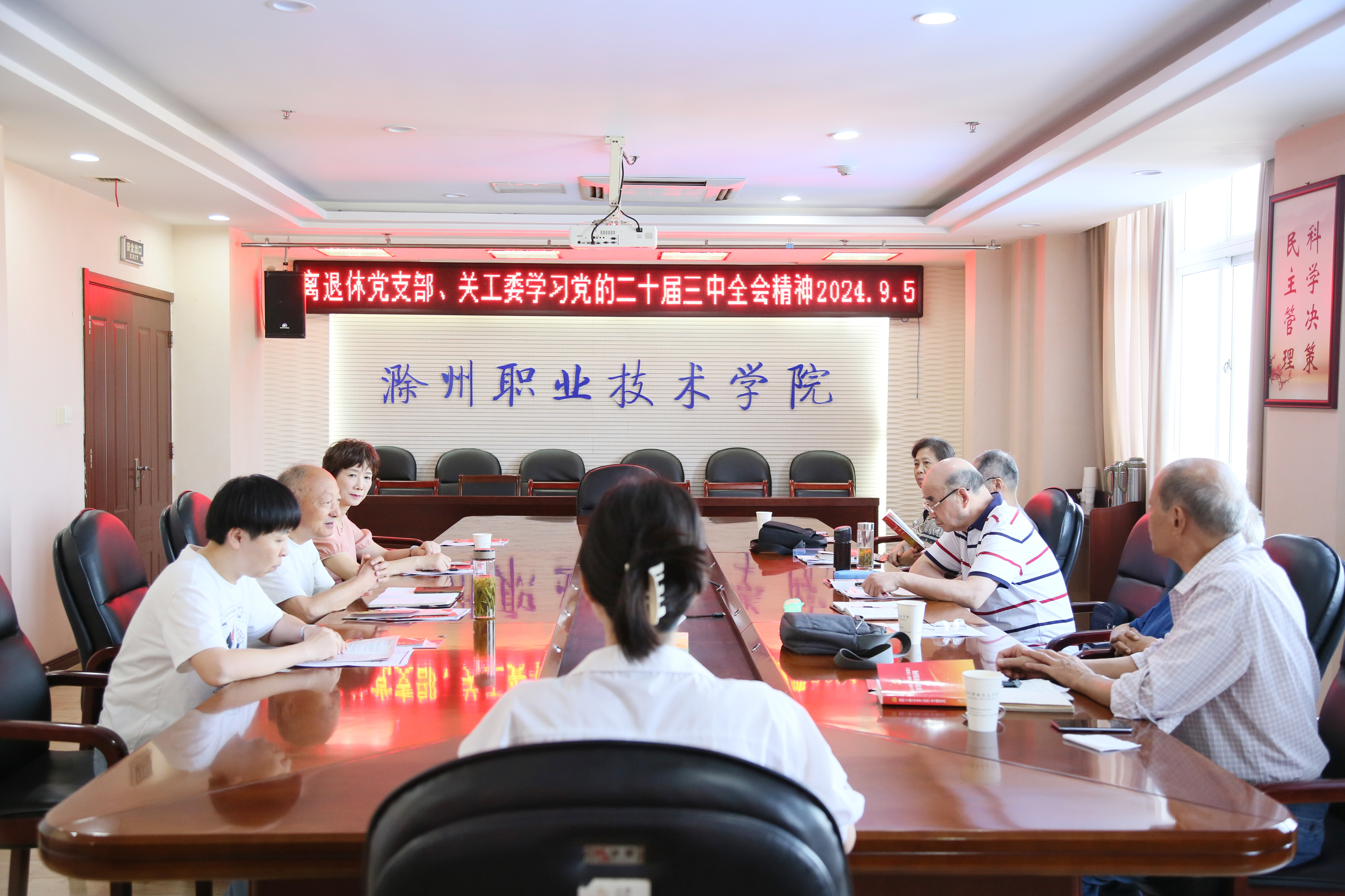 学习好贯彻好党的二十届三中全会精神是当前和今后一个时期各级关工委组织和广大“五老”及关工委干部的重大政治任务。滁州职业技术学院离退休党支部、关工委积极响应上级组织号召,于9月5日上午,在校综合楼804会议室召开会议,认真传达安徽省教育厅8月14日转发皖关工委〔2024〕13号 文件、中关工委〔2024〕6号文件《关于认真学习贯彻落实党的二十届三中全会精神的通知》,并重点学习《党的二十届三中全会<决定>学习辅导百问》中的有关内容。增进老同志对党的创新理论的政治认同、思想认同、理论认同和情感认同的同时,为推进党的二十届三中全会精神学习走深走实,关工委创新工作方法,进行学习宣传。