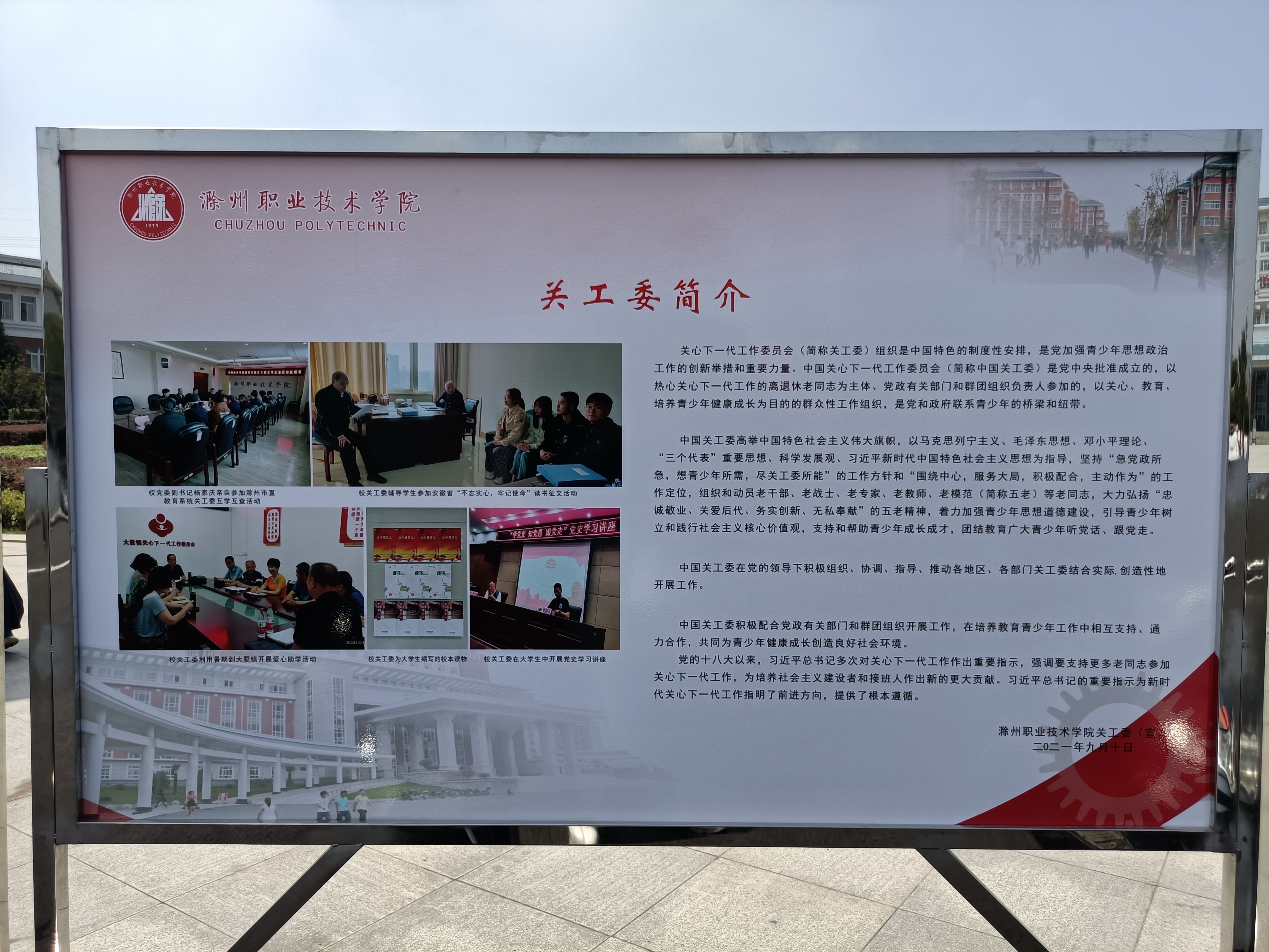 同时,关工委为便于新同学对校关工委组织的认识和了解,认真学习和研究,把关工委组织的性质定位、目标任务和五老精神等,编辑成关工委简介。在校领导重视和宣传部的大力支持下,将其制成正式展板,宣传在校园中,为全方位育人营造良好的社会氛围。
