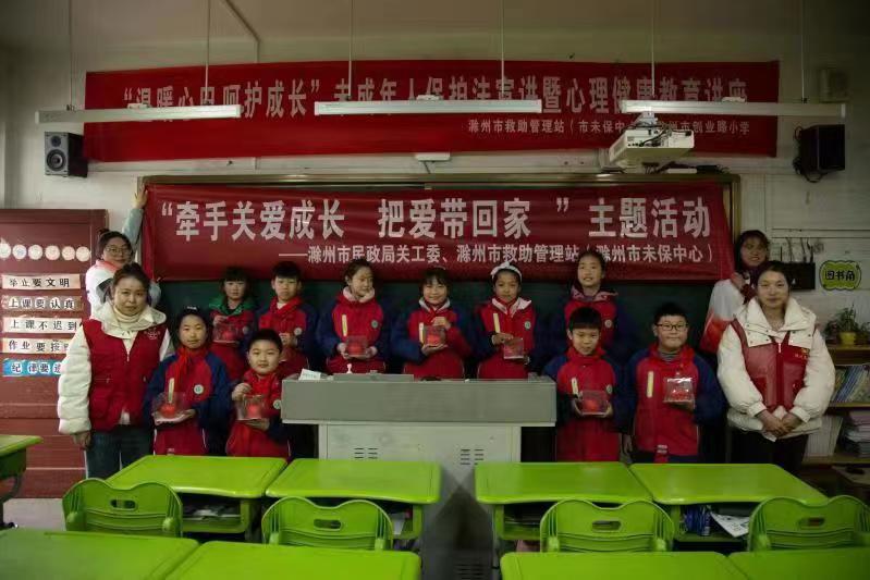 2月8日,春季开学第一周,滁州市民政局关工委联合市救助站到创业路小学开展“牵手关爱成长、把爱带回家”主题关爱未成年人健康成长活动。主要宣传未成年人保护法和举行心理健康教育讲座。组织小学生观看《未成年人保护法》视频宣传片,通过师生互动重点从家庭暴力、校园霸凌、网络诈骗等方面进行形象生动的解读,从而增强小学生们的自我保护意识和远离违法犯罪行为的能力。在心理健康教育时社工志愿者用专业知识的技巧、生动的语言、通俗易懂的案例帮助学生了解情绪的基本类型、情绪对人的影响、怎样摆脱不良情绪等心理健康知识。以帮助学生们缓解对开学的焦虑情绪,为他们在学习和生活中遇到各种困难挑战时传授了缓解压力的基本方法。此次活动,使同学们深刻感悟到遵法、学法、守法、用法的重要性,帮助同学们掌握了控制调解自己情绪的方法。同时对个别特困生进行了慰问。