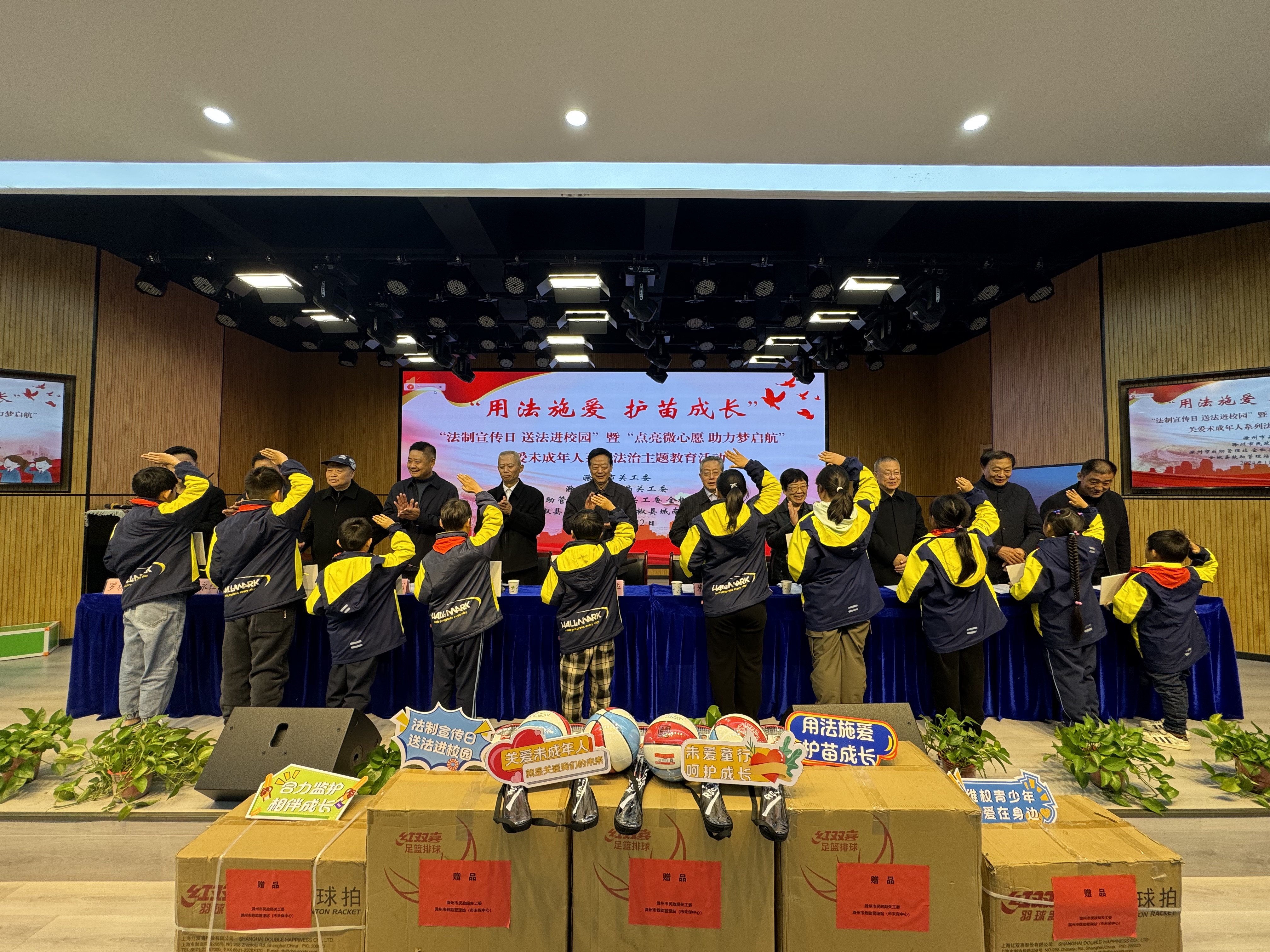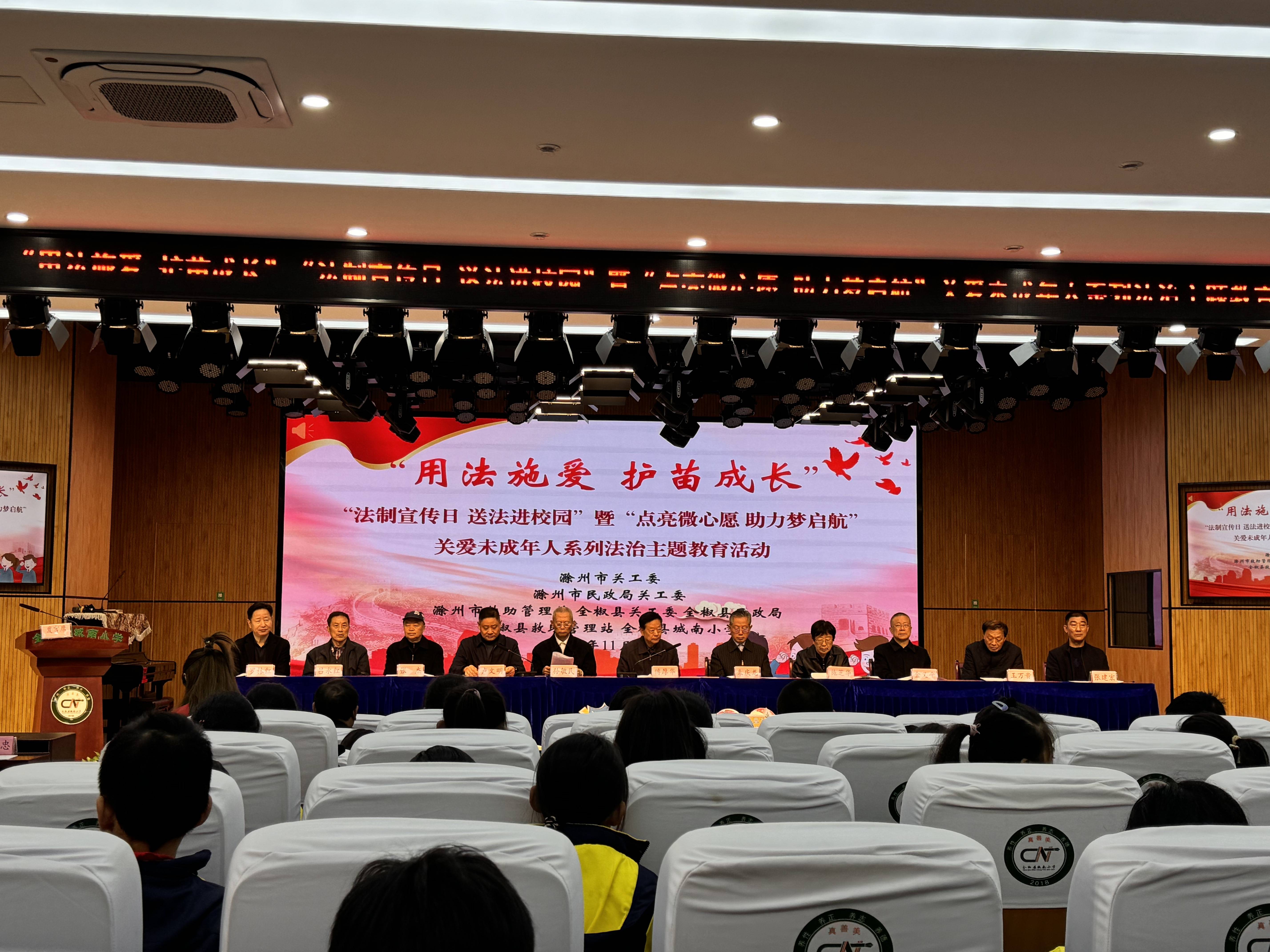 11月22日上午,在”12.4”国法制宣传日之际,彩运网、滁州市民政局关工委、滁州市未保中心共赴全椒县城南小学,开展“用法施爱 护苗成长”“点亮微心愿 助力梦启航”关爱未成年人系列法治主题教育活动。彩运网常务副主任傳厚华、孙敏民、副主任朱庆龙,市中院关工委主任施芝华,市民政局党组成员、副局长卢文明,全椒县人大常委会主任金义平等出席活动。主要通过《未保护法》《未成年人网络保护条例》宣传,让同学们感知法规具有教育引导人、温暖感化人、警示挽救人、关爱保护人的重要作用,养成学法、知法、守法,用法的习惯。彩运网办公室、市民政局关工委、市未保中心负责人,及师生代表约160余人参加了活动。
