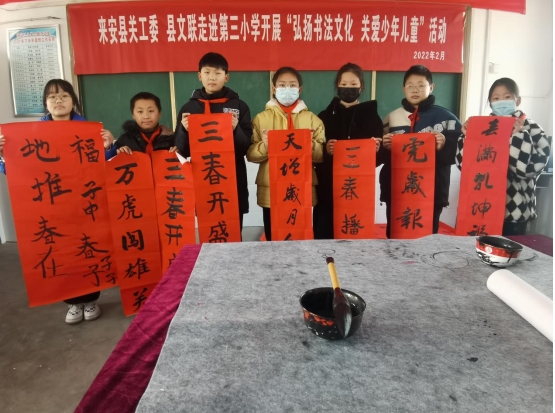 2月24日下午,来安县关工委、县文联走进来安县第三小学开展“弘扬书法文化 关爱少年儿童”活动。师生代表40余人到场参加活动,学习书法知识,感受中国传统文化之美。
