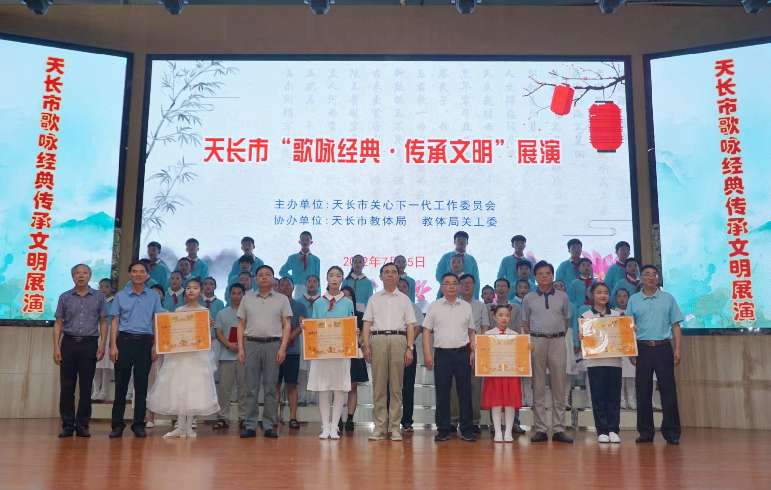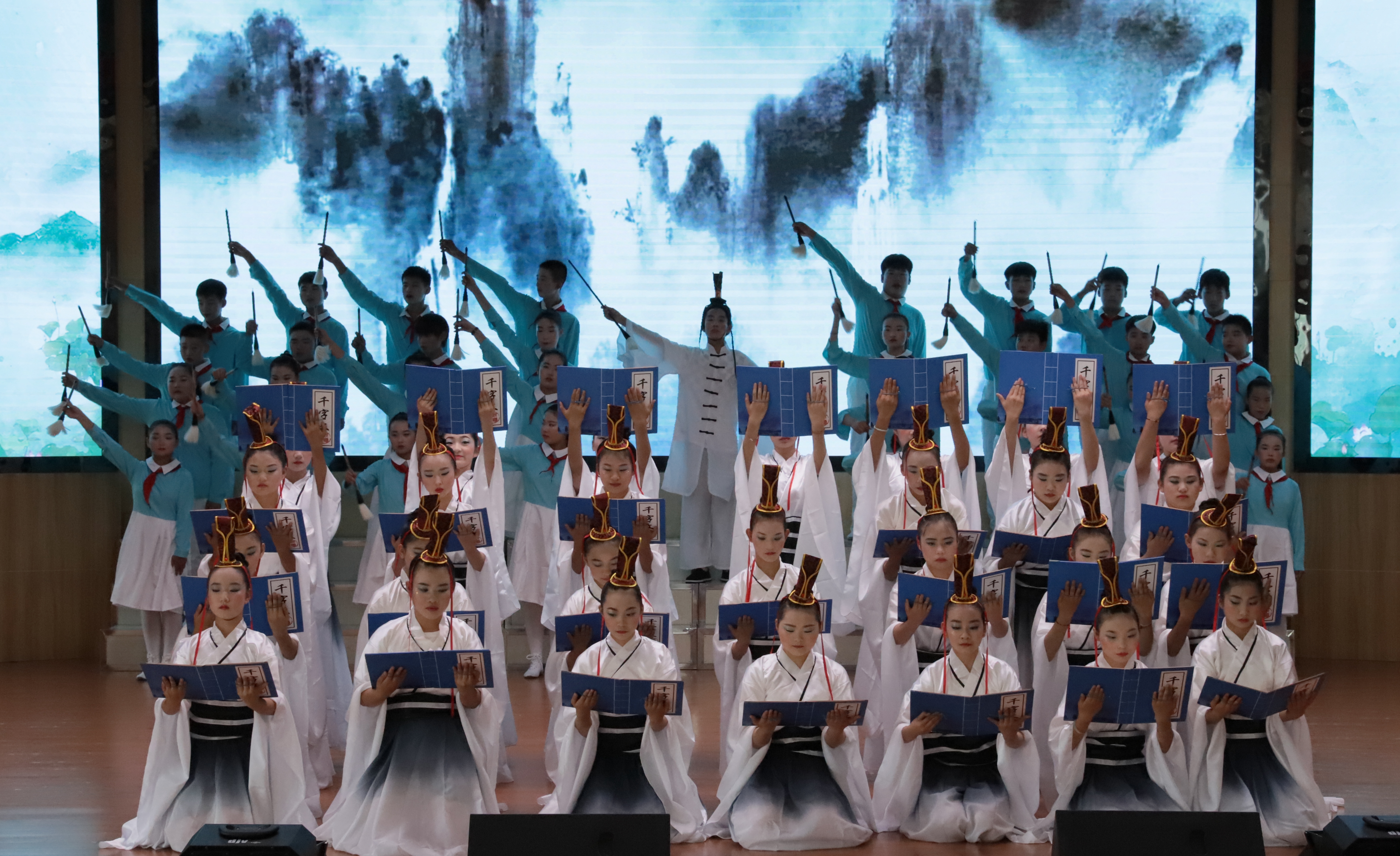 融合舞蹈、音乐等不同元素,现场,来自市城南小学、金集小学、天长二中、汊涧中学四个学校的学生代表队,分别表演了《明日歌》、《村居》、《长相思》、《江南》、《黄鹤楼》、《游子吟》、《春晓》、《咏鹅》、《千字文》等9首曲目,参演学生集体诵国学、唱国学、演国学,艺术演绎了中华传统经典的魅力。他们身着传统服饰或校服,手执书卷,抚琴轻吟,唱词行礼,闻歌起舞,或婉约,或豪放,或深情款款,或慷慨激昂……经典诗词嵌入现代音乐,在优美舞蹈中表达,再辅以大屏背景的烘托,唯美地诠释了华夏文明的悠久灿烂,赢得现场观摩领导和百余名师生的阵阵掌声。