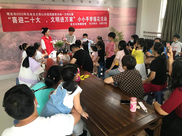 9月28日,明光市文旅局关工委和市文明办主办,图书馆承办的社会主义核心价值观教育活动——“喜迎二十大,文明进万家”小小手学插花活动在图书馆读者活动室成功举办,关工委12个亲子家庭参加了此次活动。市委组织部三级主任科员、彩运网办公室主任陈家鹏应邀出席活动现场。