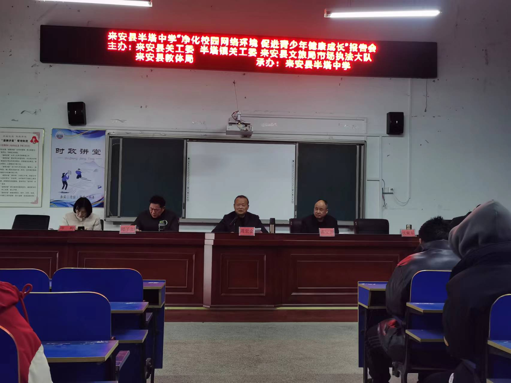 为进一步加强未成年人思想道德建设,预防未成年人沉迷网络,增强未成年人对不良信息及网游的辨别能力,维护未成年人身心健康。2月28日下午,县关工委、县教体局、县文化市场综合执法大队等部门组织文化市场“五老”义务监督员,在革命老区半塔中学举办了“净化校园网络环境 促进青少年健康成长”报告会。此次报告会在半塔中学多媒体教室举行,全校200多名师学生聆听了本次报告会。