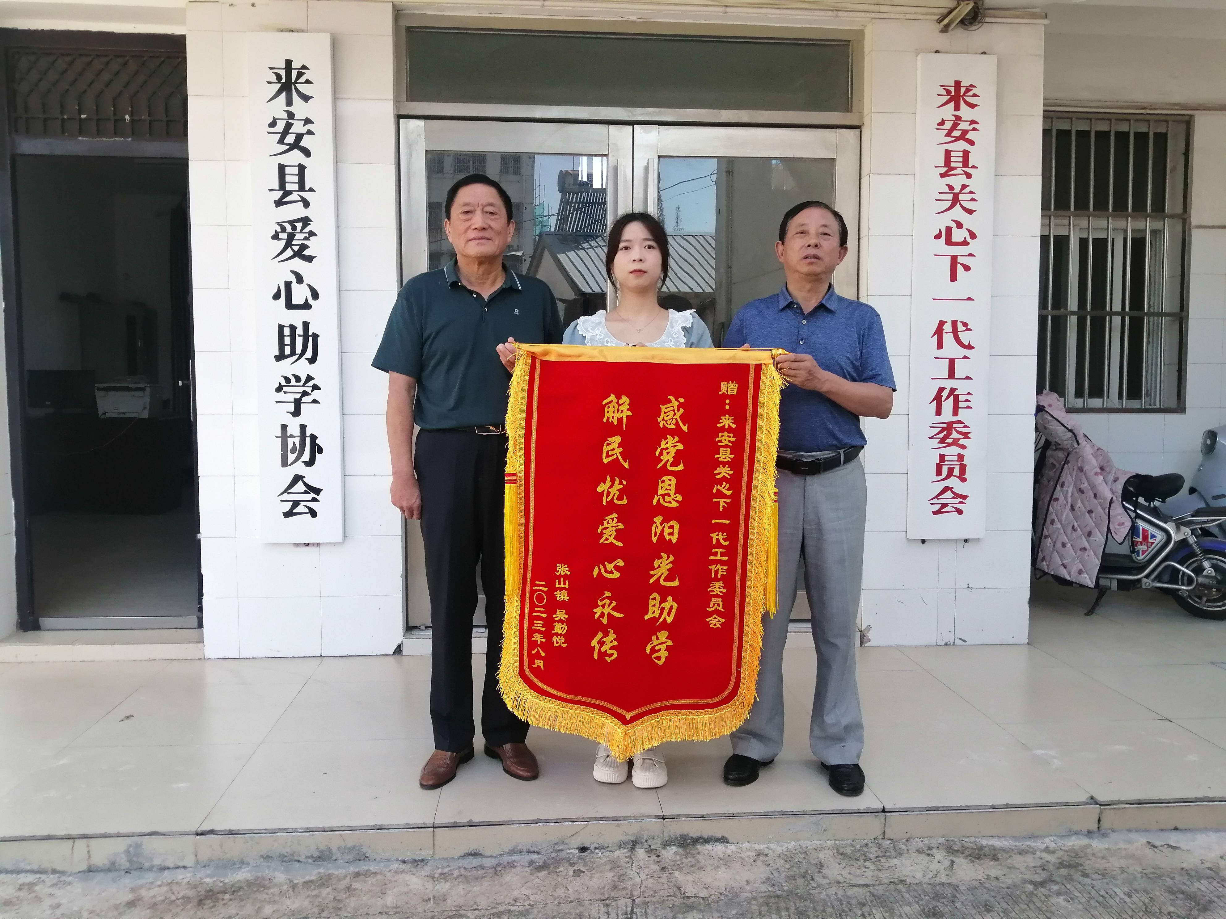 8月31日,湖北工业大学研二学生吴勤悦给来安县关工委赠送锦旗,感谢县关工委从小学到研究生12年的爱心助学,用知识改变了自己的命运。