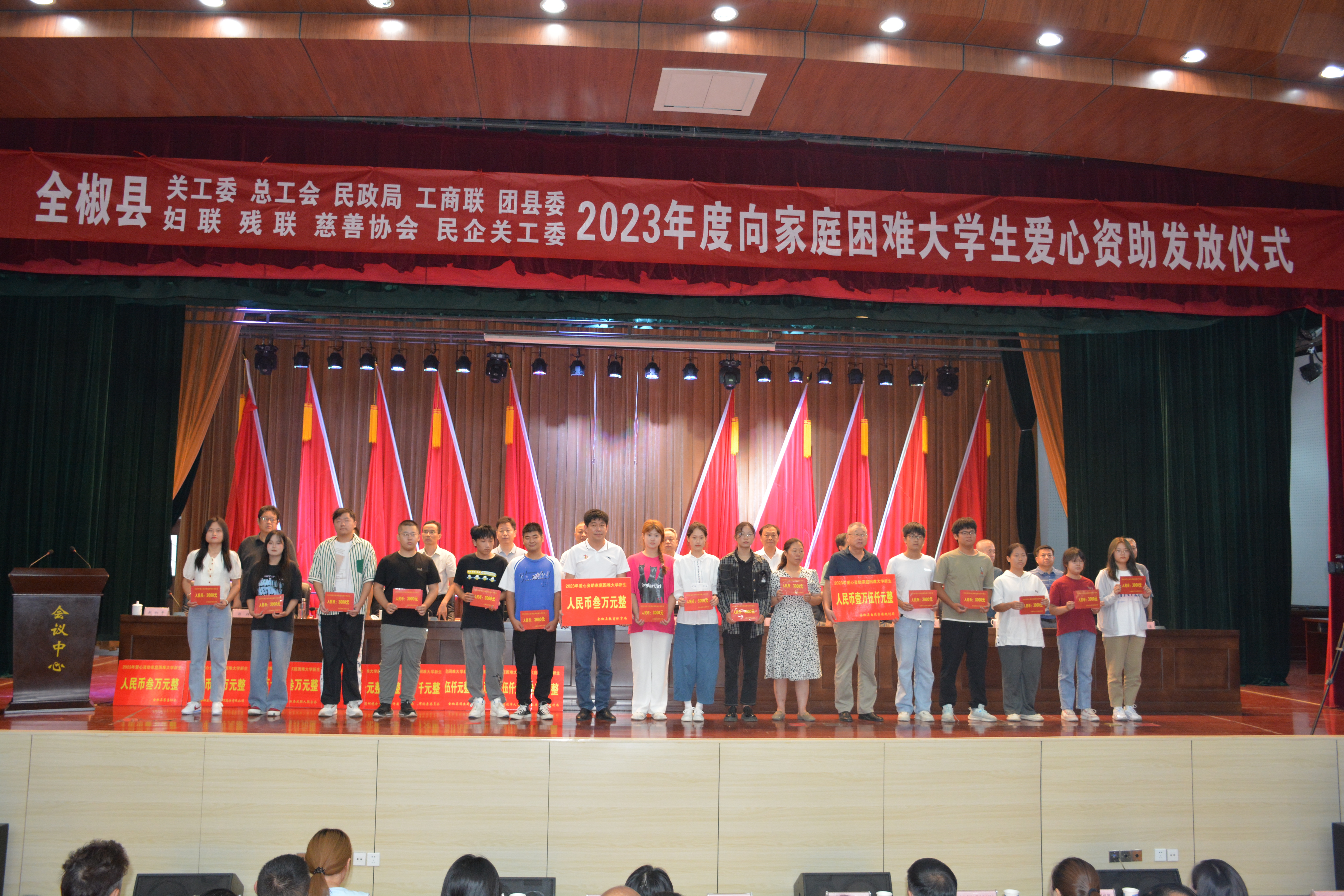 2023年8月30日,全椒县关工委与县总工会、民政局、工商联、团县委、妇联、民营企业关工委、残联和县慈善协会等九家单位在县会议中心椒陵会堂联合举行2023年度向家庭困难大学生爱心资助发放仪式。