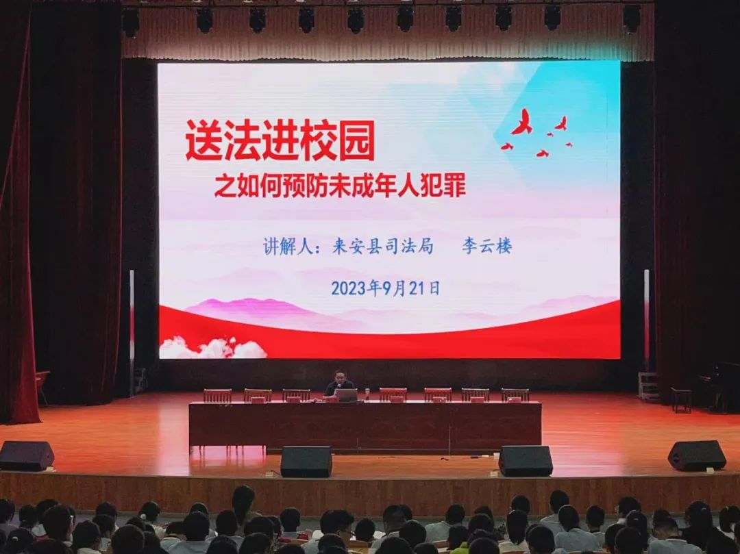 为加强青少年法治教育,丰富学生的法律知识,让学生学法、懂法、守法、用法,增强学生的法律观念,提高学生自我保护意识和能力,2023年9月21日下午,来安县关工委德育报告团在阳光初级中学举行青少年法制教育报告会活动。