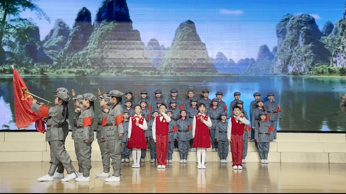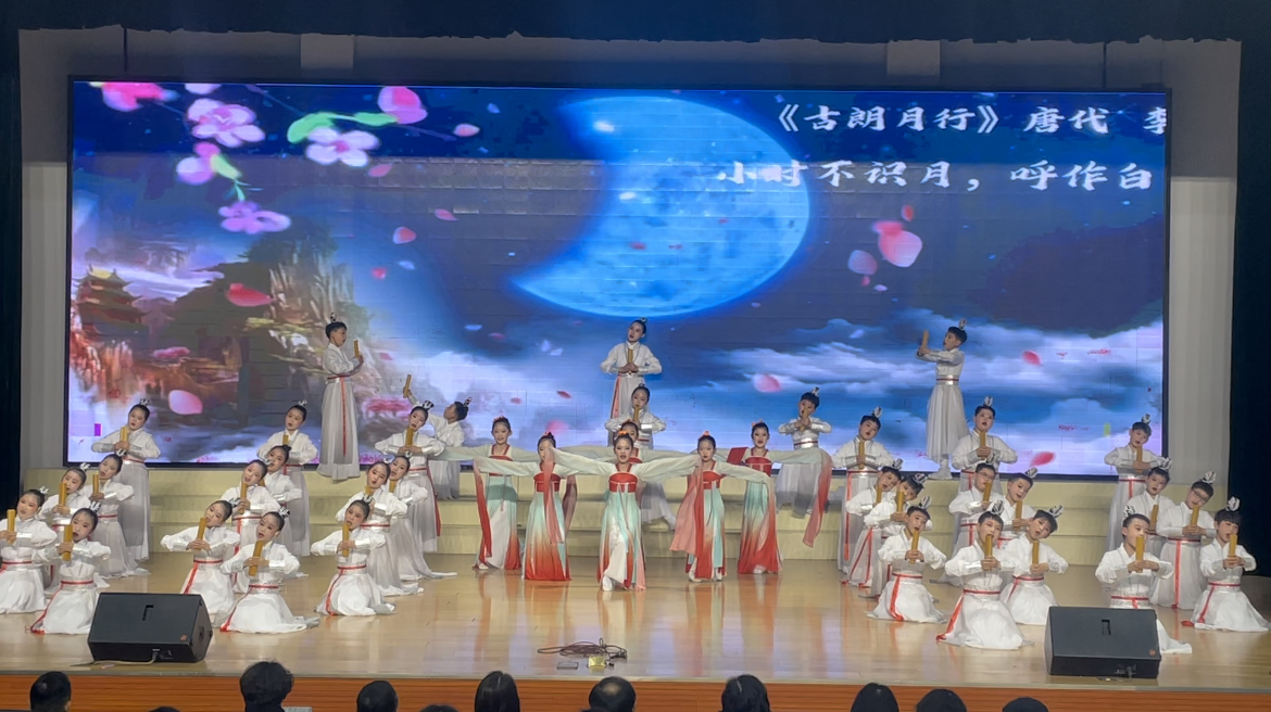 既有独诵,又有齐诵;既有表演朗诵,又有配乐朗诵……现场,小选手们满怀深情、慷慨激昂地朗诵了《沁园春·雪》、《七律·长征》、《人民解放军占领南京》、《水调歌头重上井冈山》等一首首脍炙人口的毛主席诗词作品,让在场师生仿佛又回到了那个战火纷飞的年代,又看到了那位指点江山的伟人。现场还穿插了唐诗诗词朗诵,经典的诗词嵌入现代音乐,在优美的舞蹈中表达,再辅以道具的巧妙点缀、大屏的情境烘托,唯美诠释了中华文化的悠久灿烂。