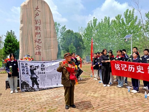 “全国道德模范提名奖获得者”“中国好人”严明友老师讲述了在朱湾镇大户刘村革命烈士在抗日战争和解放战争中浴血奋战、不怕牺牲的光荣历史,追忆革命先辈的高尚情怀;学生代表致青春宣言,大家向纪念碑敬献鲜花,寄托哀思。活动最后,全体人员昂首挺胸的齐声喊出“请抗战忠魂检阅我们的青春!”“抗战记忆不绝于耳,抗战精神不绝于心!”的铮铮誓言,以表敬意。