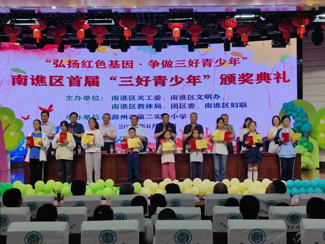 为引导广大青少年崇德尚善、见贤思齐,自觉践行社会主义核心价值观,做到“德智体美劳”全面发展,成为合格的社会主义接班人和建设者,6月29日,南谯区举办首届“三好青少年”颁奖典礼。区关工委全体成员,区直相关单位负责同志,各镇(街道)关工委执行主任,各校分管负责人,全体当选“三好青少年”学生等参加活动。 活动宣读了全区首届当选“三好青少年”名单并颁发了荣誉证书。随后当选“三好青少年”中小学生代表先后作了发言。 会议强调,要统筹抓好思想道德教育、文化教育、家庭教育、法制教育和科技教育,帮助青少年扣好人生第一粒扣子、迈好人生第一步。要在学习上勤奋努力,追求知识的卓越;在思想上积极向上,树立正确的世界观、人生观和价值观;在行为上遵纪守法,做到诚实守信、友善待人。要在困难面前不屈不挠、在挑战面前敢于担当、在责任面前勇于奉献,自觉弘扬中华优秀传统美德,倡导新风正气,从一点一滴、一言一行做起,成长为品德高尚、言行文明的青少年,进一步激发斗志和激情,努力学习,自重、自尊、自信、自强,传承红色基因,努力做社会主义建设者和接班人。
