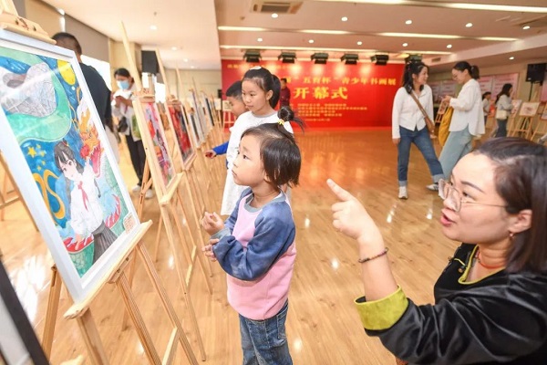 据了解,现场共展出近百幅青少年书法、绘画作品,作品主题鲜明、内涵丰富、表现形式多样,充分发挥了广大青少年在传统文化领域的优势作用,在弘扬优秀文化的同时,抒发爱国情怀,传递时代精神,用笔墨向中华人民共和国成立75周年献礼。