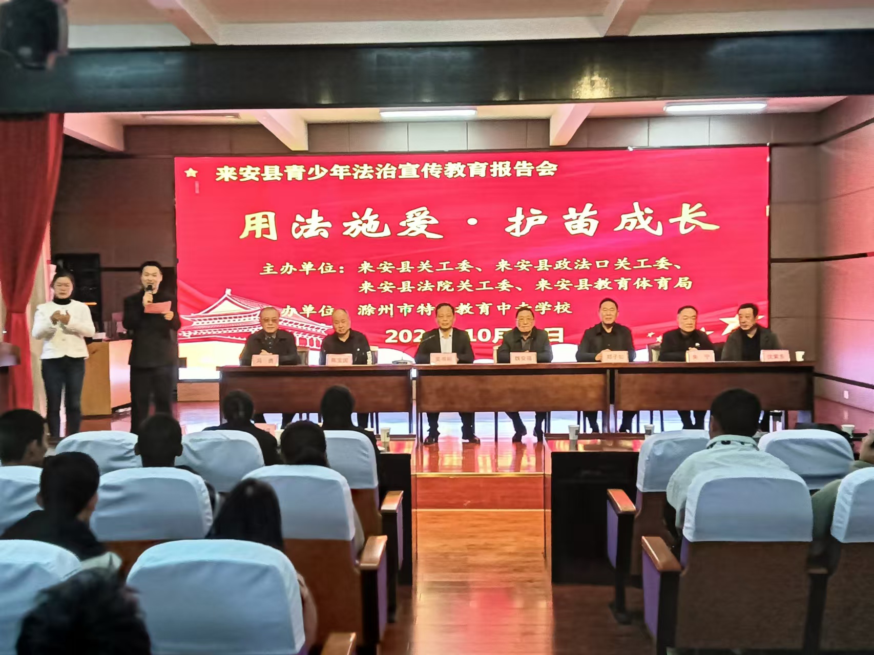 2024年10月24日上午,由来安县关工委、来安县政法口关工委、来安县法院关工委、来安县教体局主办的“用法施爱 护苗成长”青少年法治宣传教育报告会在滁州市特殊教育中专学校顺利举行。此次报告会旨在提高对未成年人保护的法律意识,为孩子们营造一个安全、健康、和谐的成长环境。县关工委常务副主任、县关工委青少年法治报告团团长魏安福及相关单位分管领导同志莅临现场齐聚一堂,共同探讨青少年法治教育的重要性和实施举措,为保护未成年人的健康成长贡献力量。