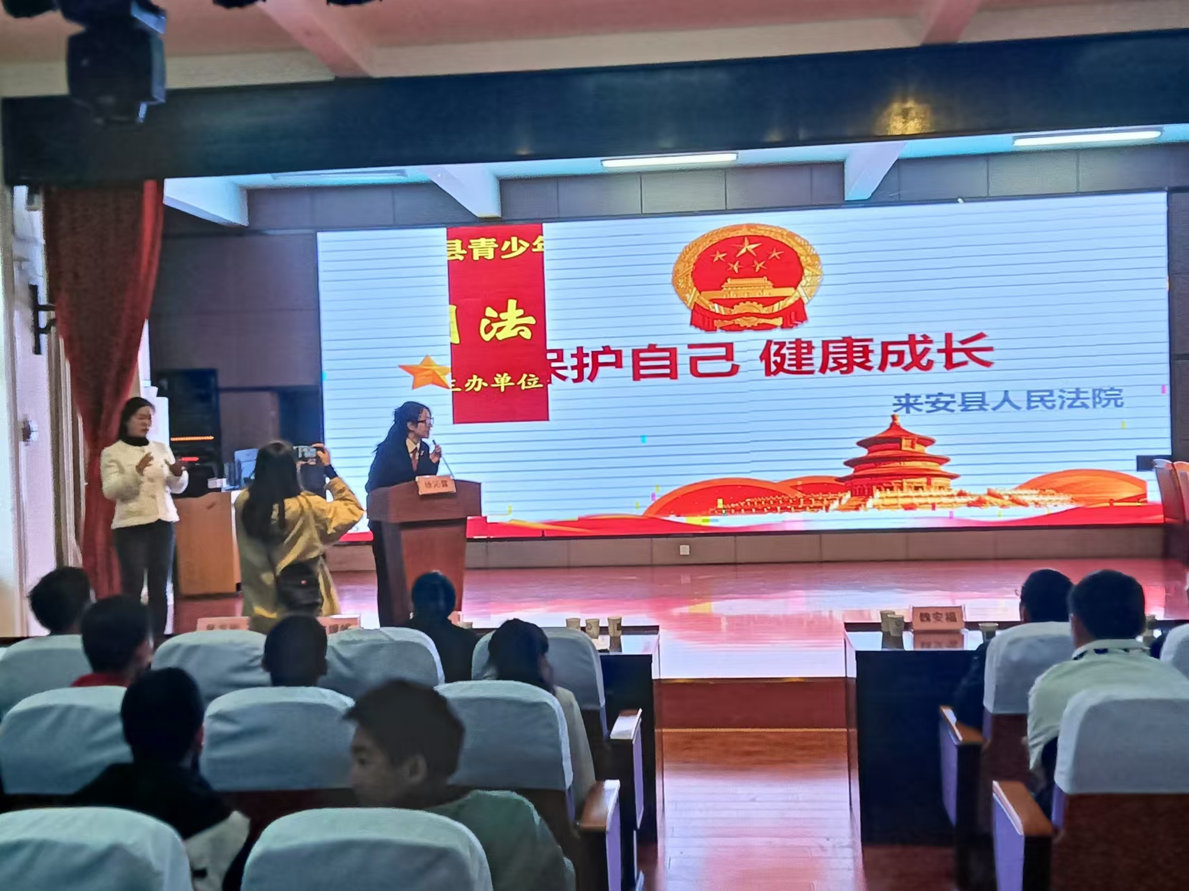 随后,县法院法官助理郭娟娟从法是什么、预防未成年人犯罪两个方面,通过展示大量日常生活中青少年违法犯罪行为实际案例,以此来告诫同学们在未来的日子里要遵纪守法拒绝不良行为,增强维权意识,要学法、懂法、守法、用法,健康快乐成长,做优秀的新时代青少年。