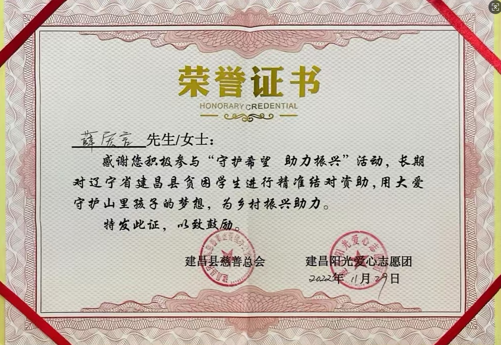 截至2024年,薛宏言已累计资助了于思雨、尚新凤等4名学生,资助金额达5万多元。在她的帮助下,尚新凤已大学毕业,现于北京工作;于思雨也完成高中学业,目前在辽宁打工。