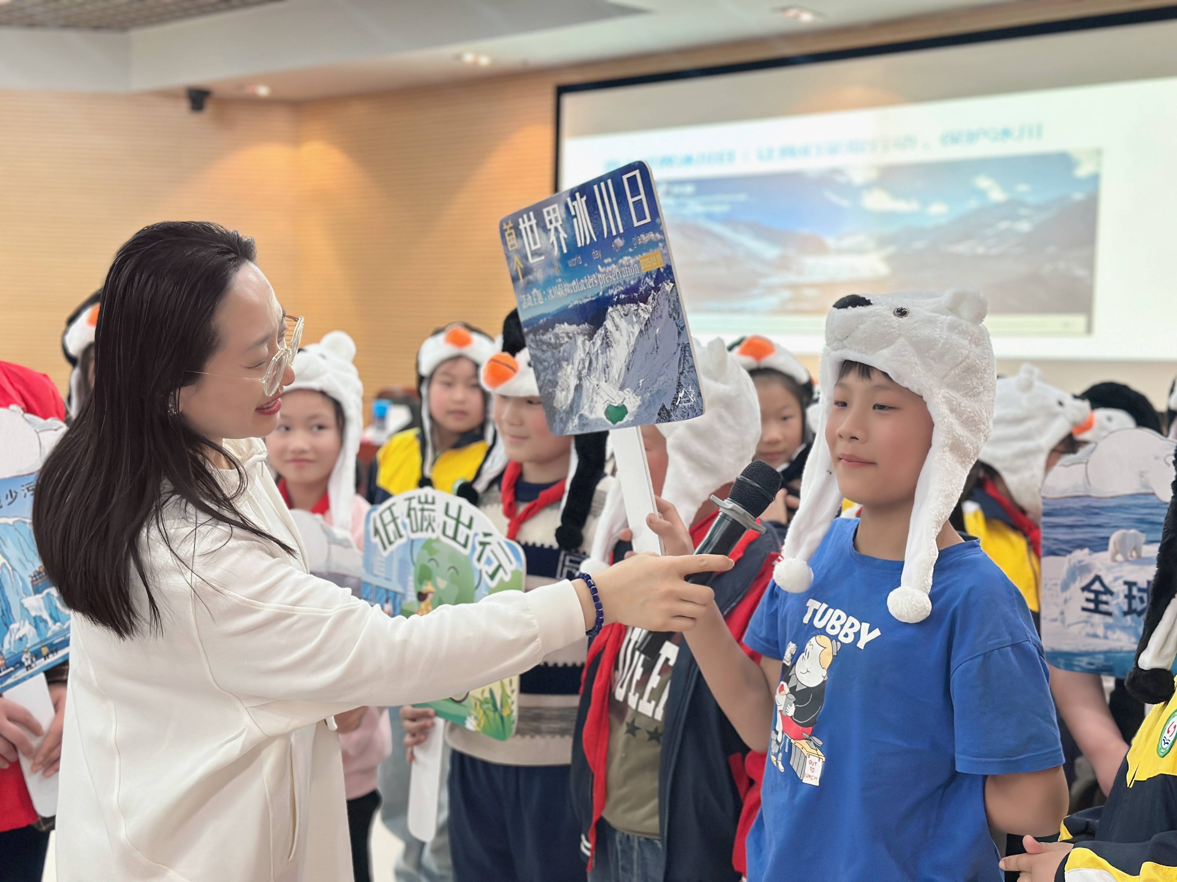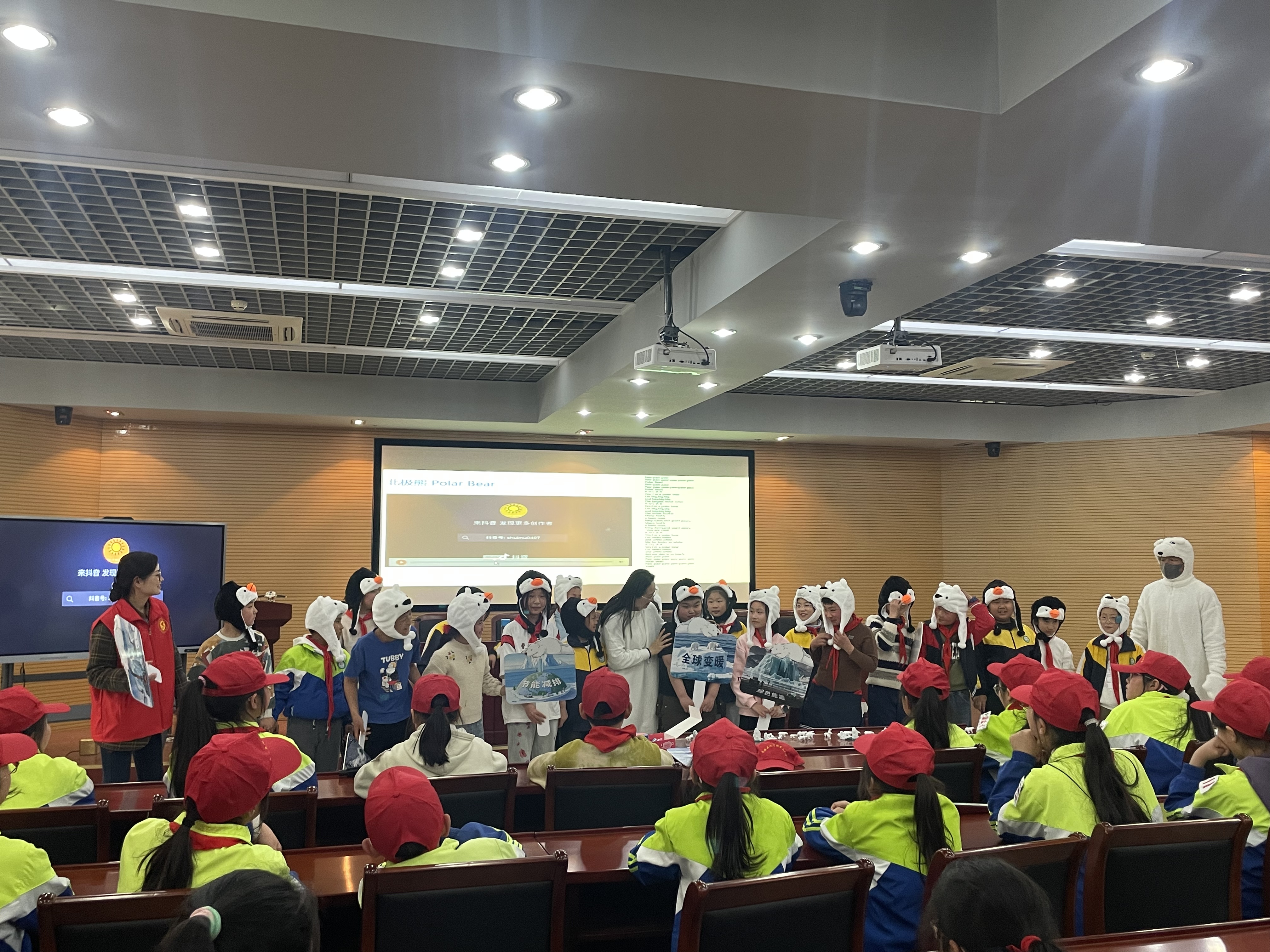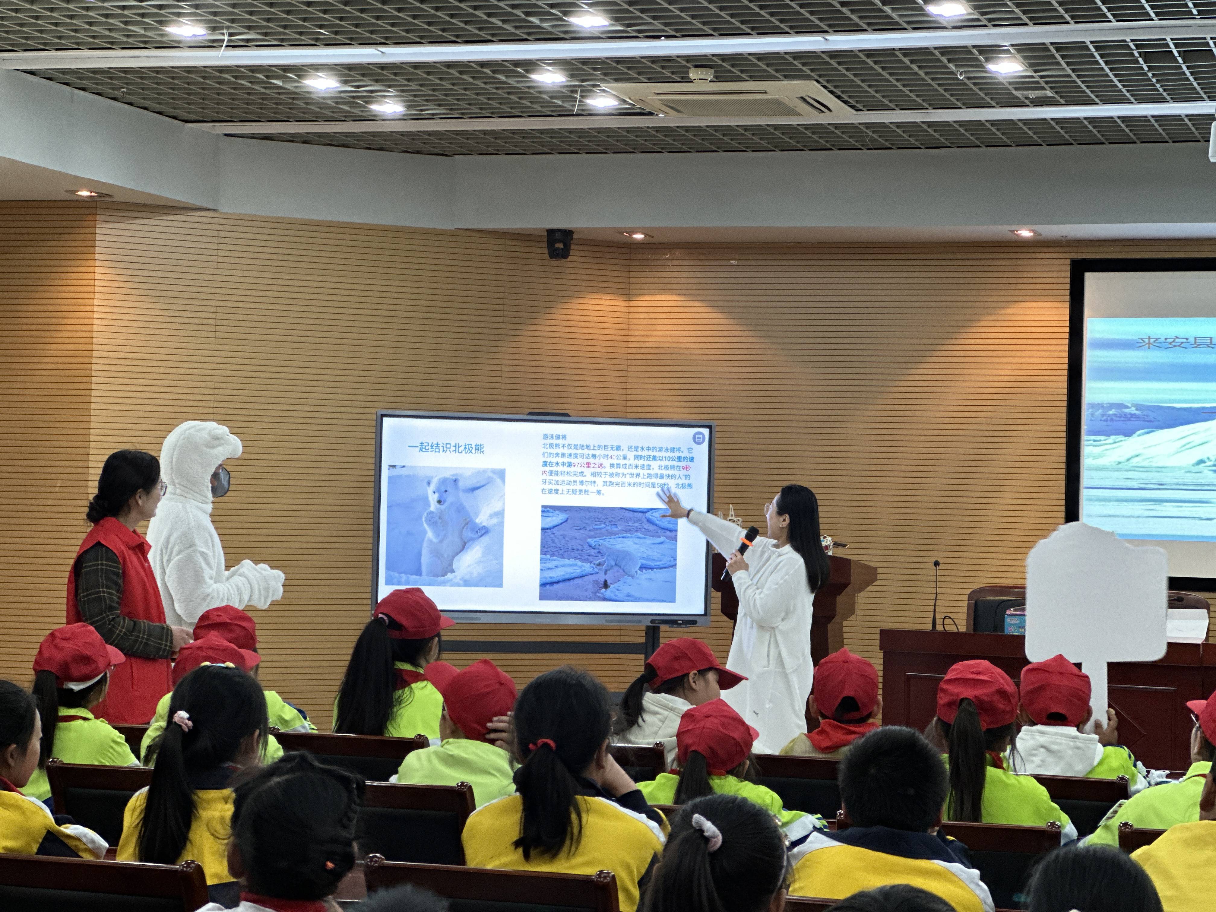 活动中,科普志愿者运用科普中国权威素材,让同学们结识冰原之王北极熊,从其形态特征、生活习性,气候变化对北极熊食物链的严重影响、生态价值与保护状况、国际北极熊日的设立等方面,认识全球气候变暖、冰川融化的原因和危害性。活动现场,通过北极熊和小企鹅找朋友的游戏方式,共同寻找减缓冰川融化速度的方法,宣传2025年3月21日全球首个“世界冰川日”,旨在激发起青少年保护冰川,参与低碳未来的实践行动,同时呼吁全球采取行动,应对气候变化对冰川和生态环境的威胁,共同守卫地球的“白色宝藏”。活动最后,同学们在《欢快的北极熊》歌舞剧中结束今天的科技馆科普之旅。