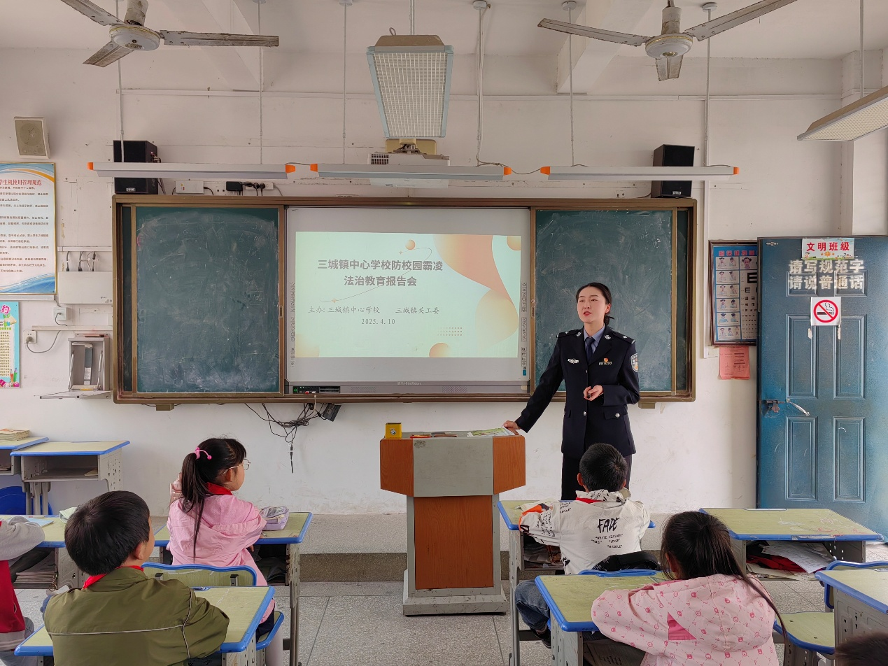 为深入贯彻落实国家关于加强青少年法治教育的决策部署,有效预防和遏制校园欺凌事件的发生,2025年4月10日上午,三城镇中心学校关工委联合三城镇关工委、三城镇派出所,特邀法治副校长刘雅君警官走进校园,为全校师生带来了一场主题为“用法施爱·护苗成长——向校园欺凌说‘不’”的法治教育报告会。