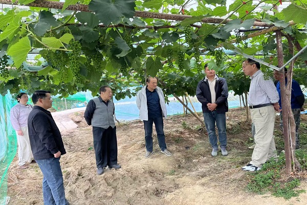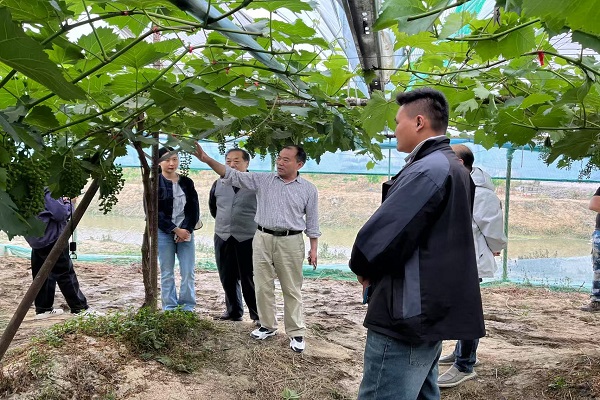 滁州市农业农村局关工委主任朱成林,副主任、市农业农村技术推广中心原主任朱国美及工作人员李斐深入田间地头,实地查看葡萄生长情况,详细了解种植园在品种选育、水肥管理、病虫害防治等方面存在的问题。区关工委主任杨柳、常务副主任陈立及街道相关负责人一并参加。