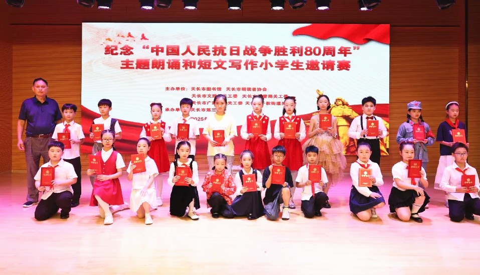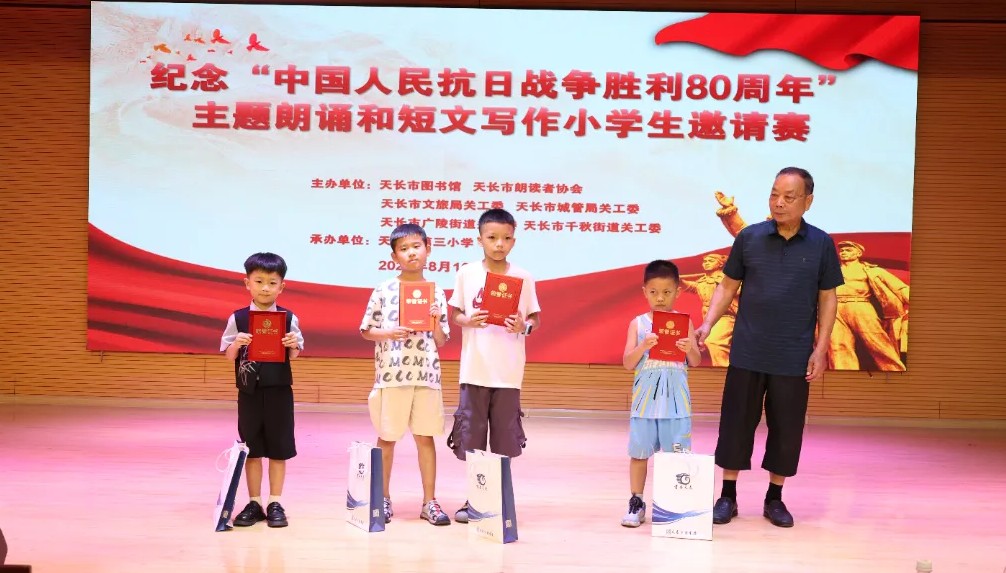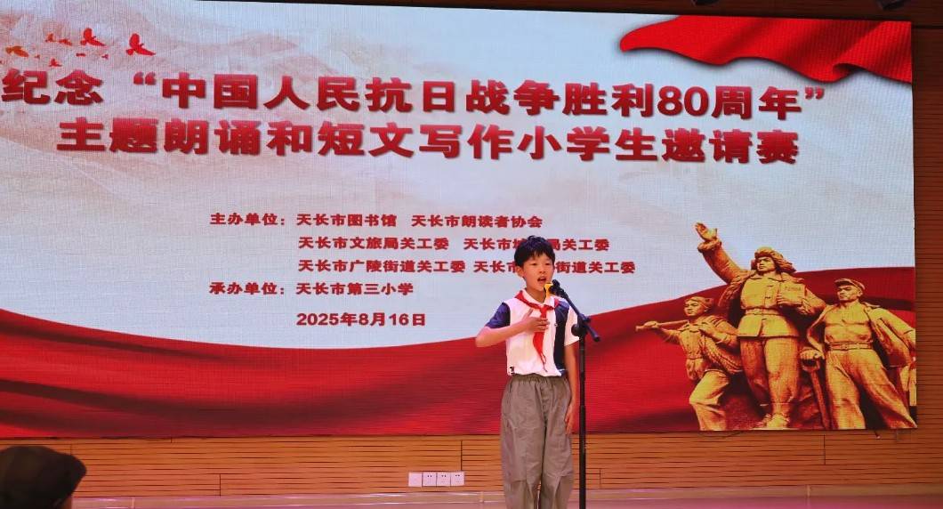 8月16日,由天长市图书馆、市朗读者协会主办、市文旅局关工委、市城管局关工委、广陵街道关工委、千秋街道关工委协办,市第三小学承办的小学生“纪念中国人民抗日战争胜利80周年”朗诵与短文写作大赛圆满落幕。活动吸引了全市200余名小选手报名,共收到初赛作品186件,经过激烈角逐,最终评选出一、二、三等奖若干名。