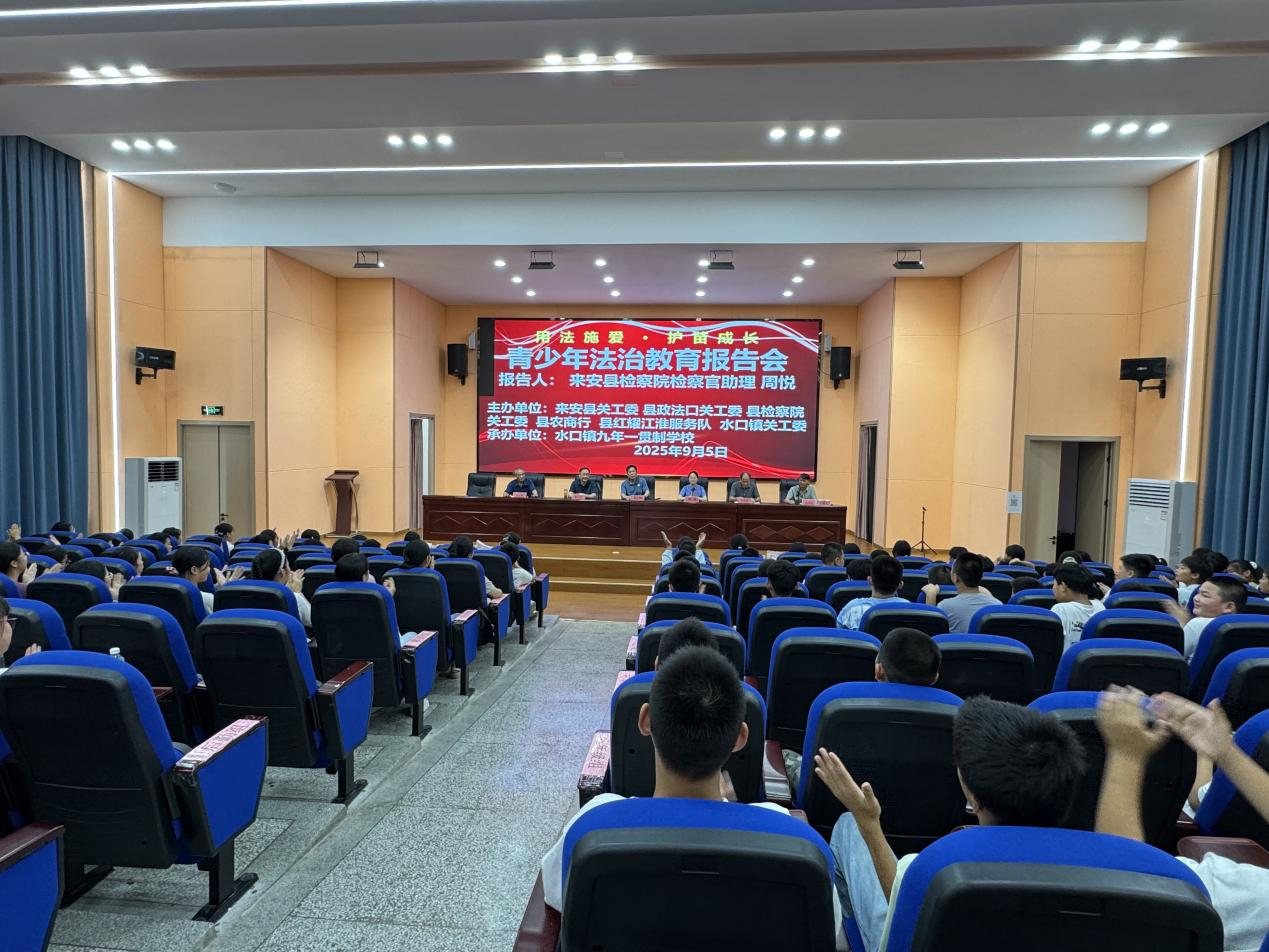金秋九月,法治护航。为深入贯彻落实青少年法治教育要求,助力青少年健康成长,9月5日下午,来安县关工委在水口镇九年一贯制学校举行“用法施爱·护苗成长”法治专题教育报告会。